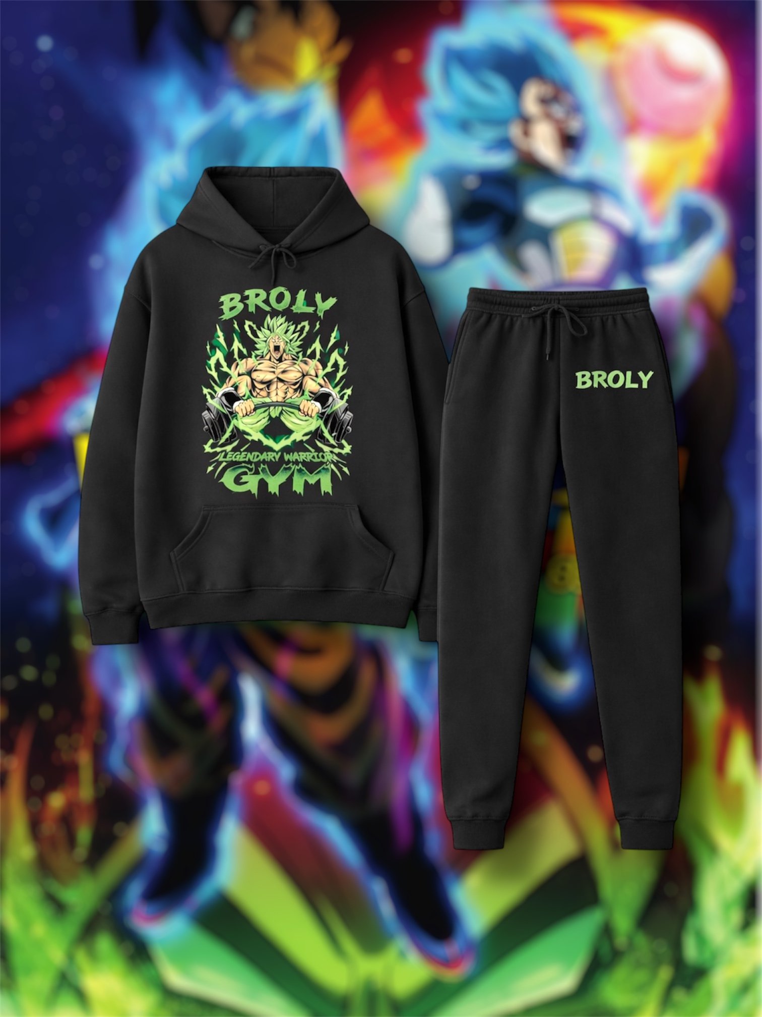 Unleash your power with this Broly Legendary Warrior Gym Jogging Set. Designed for true anime fans, this high-quality set includes a stylish black hoodie and matching jogger pants featuring a bold Broly print.