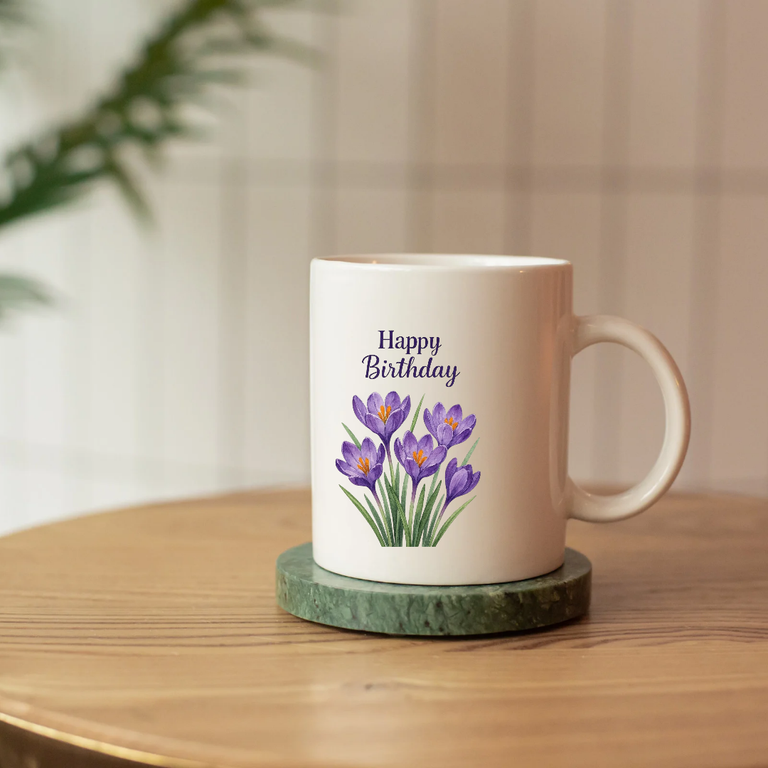 كوب أنيق بتصميم مميز يحمل عبارة Happy Birthday مع زهور بنفسجية جميلة تضيف لمسة رقيقة وهادئة.