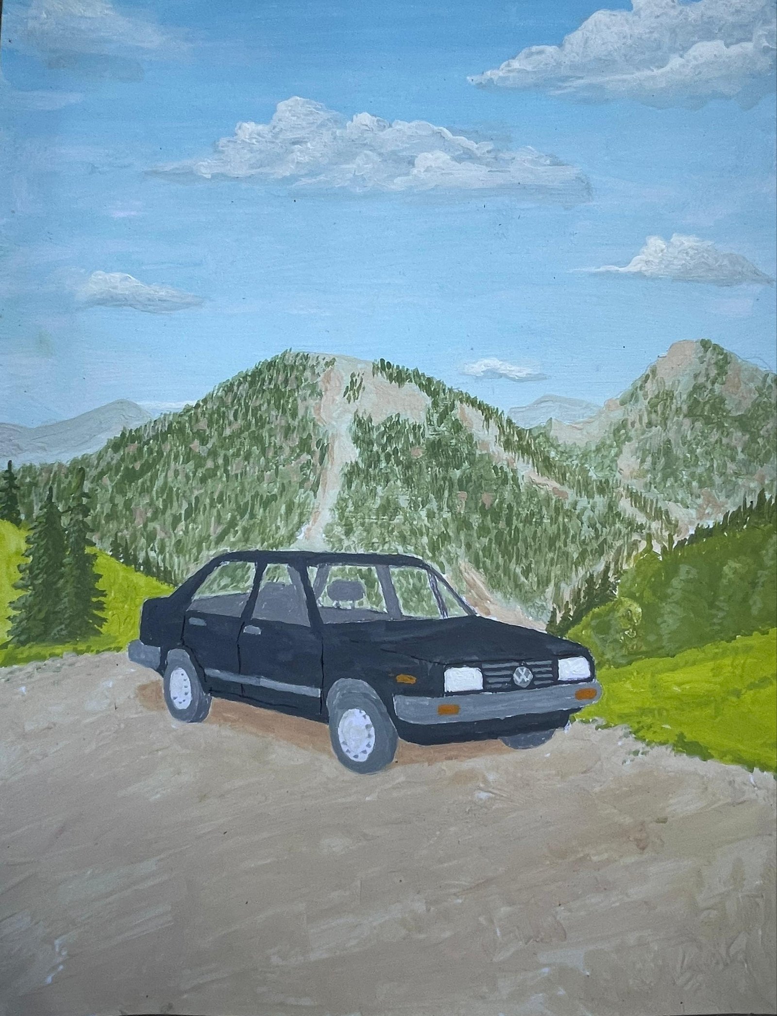 لوحة فنية مرسومة باليد تُظهر سيارة ألمانية كلاسيكية من علامة jetta سوداء اللون تقف على أرض ترابية مرتفعة بين الجبال، حيث تلامس الغيوم قمم الصخور. المشهد يعكس هيبة الجبال وروح المغامرة في لوحة تجمع بين القوة والعزلة والجمال الطبيعي.