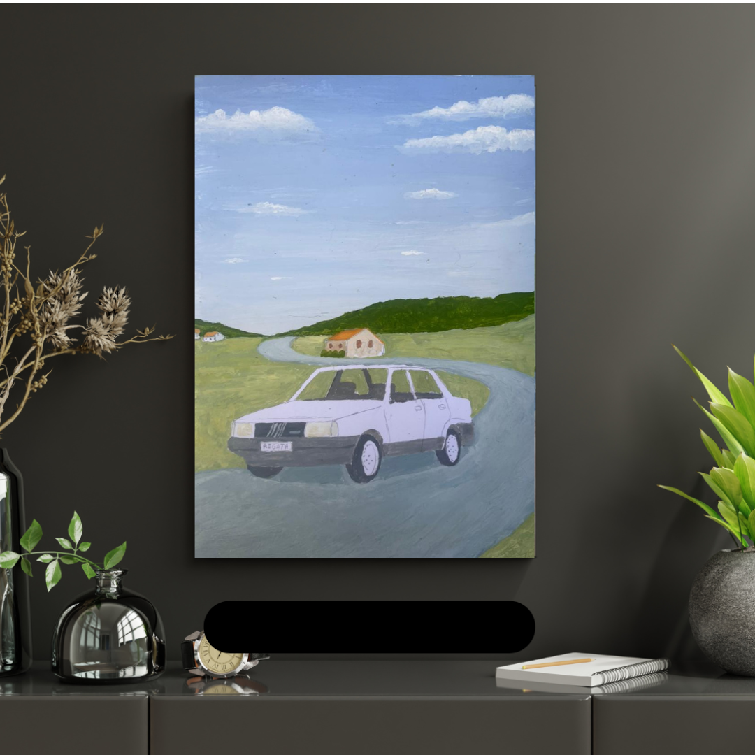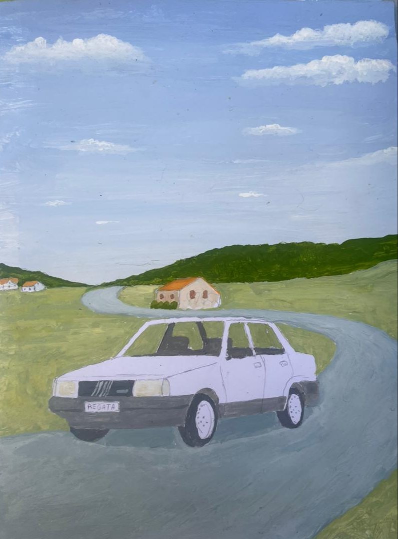 لوحة فنية مرسومة باليد تجسد سيارة فيات ريغاتا البيضاء، متوقفة برشاقة على جانب طريق ريفي تغمره الحشائش الخضراء. في الخلف تلوح بيوت صغيرة بقرميدٍ أحمر تحت سماء صافية تنبض بالسكينة. تجتمع في المشهد لمسة الطبيعة الهادئة مع رمز من رموز الثمانينات، حين كانت ريغاتا تمثل الأناقة الإيطالية، والقوة المتزنة، وصلابة التصاميم الكلاسيكية. لوحة تنضح بالحنين لجمال تلك الحقبة وسحرها الخالد. 🚗🎨