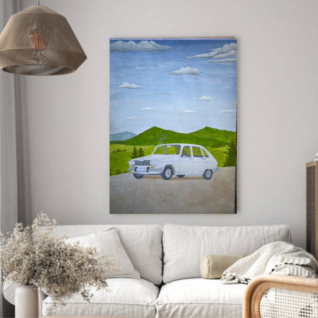 لوحة فنية مرسومة باليد تُظهر سيارة رونو 16 مركونة على طريق ترابي وسط الطبيعة، وأمامها أشجار صنوبر وارفة؛ يضفي المشهد هدوءًا ريفيًا على سيارةٍ كانت تُحظر وقوفها أمام البنوك والمصارف بسبب سرعتها وخفتها وخشية استغلالها في عمليات السطو.
