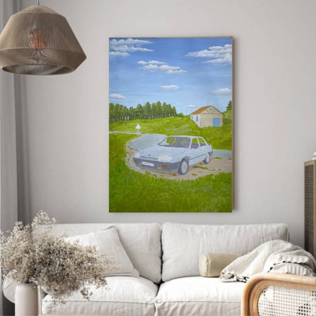 لوحة فنية مرسومة باليد تُظهر سيارة رونو 25 رمادية اللون مركونة على رصيف ترابي بمحاذاة طريق ريفي متعرّج، وخلفها بيت ريفي هادئ خُصّص للاستراحة في أيام العطلة. المشهد ينبض بروح الريف والذكريات الهادئة، حيث تمتزج واقعية التفاصيل بلمسة حنين دافئة.