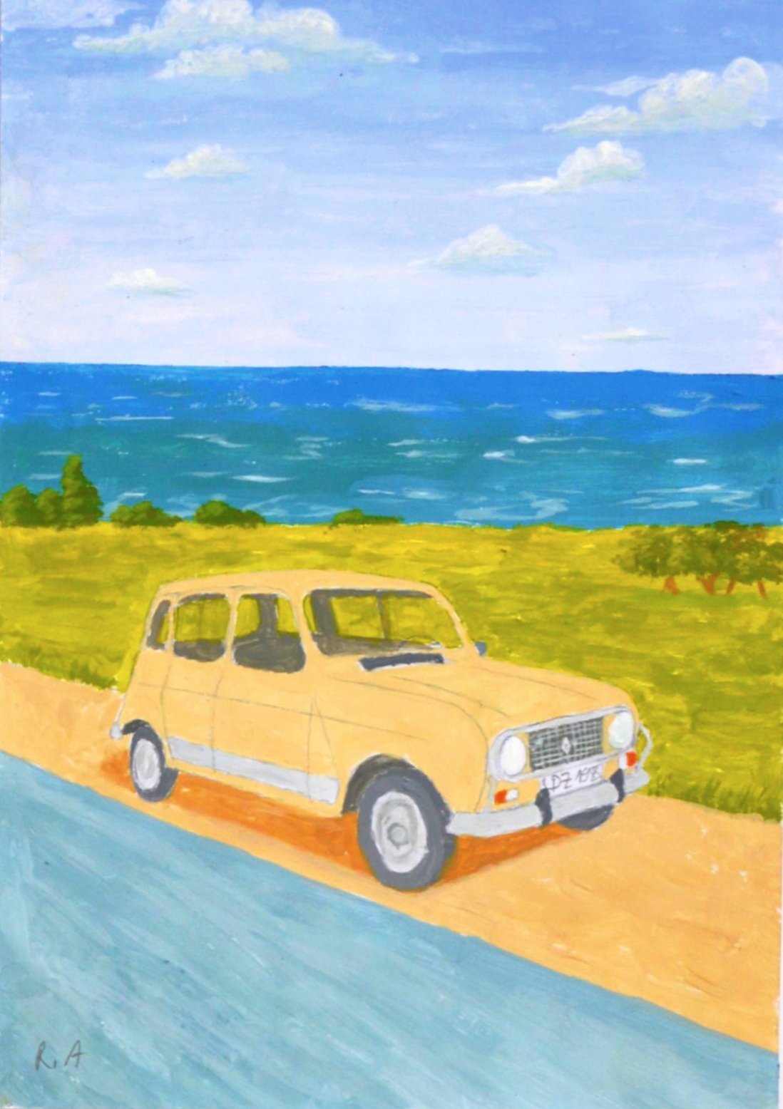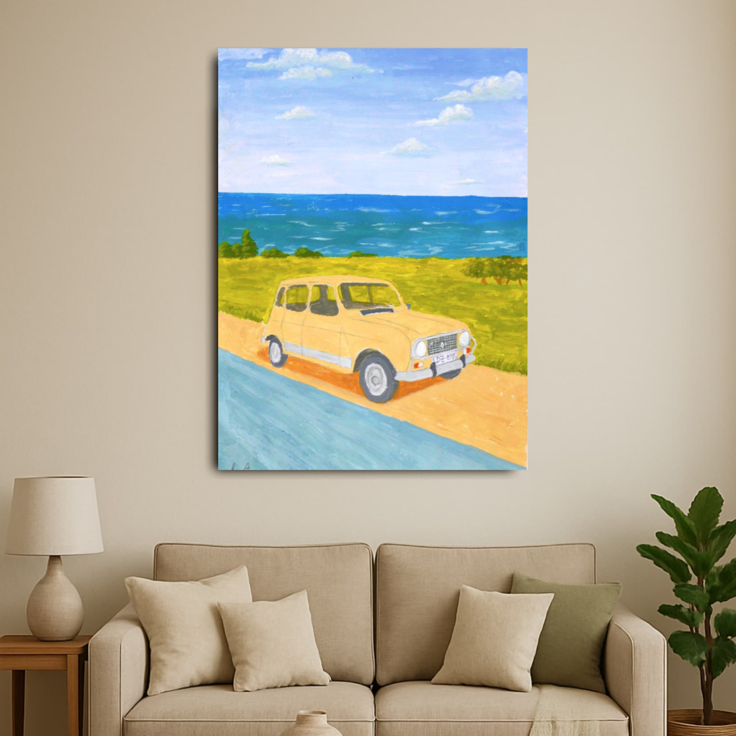 لوحة فنية مرسومة يدويًا  مطبوعة على قماش تُجسد سيارة رونو R4، تلك السيارة العزيزة على قلوب الجزائريين، تقف على رصيف ترابي بسيط، غير بعيد عن الشاطئ، حيث يمتزج هدير البحر مع سكون الذكريات.