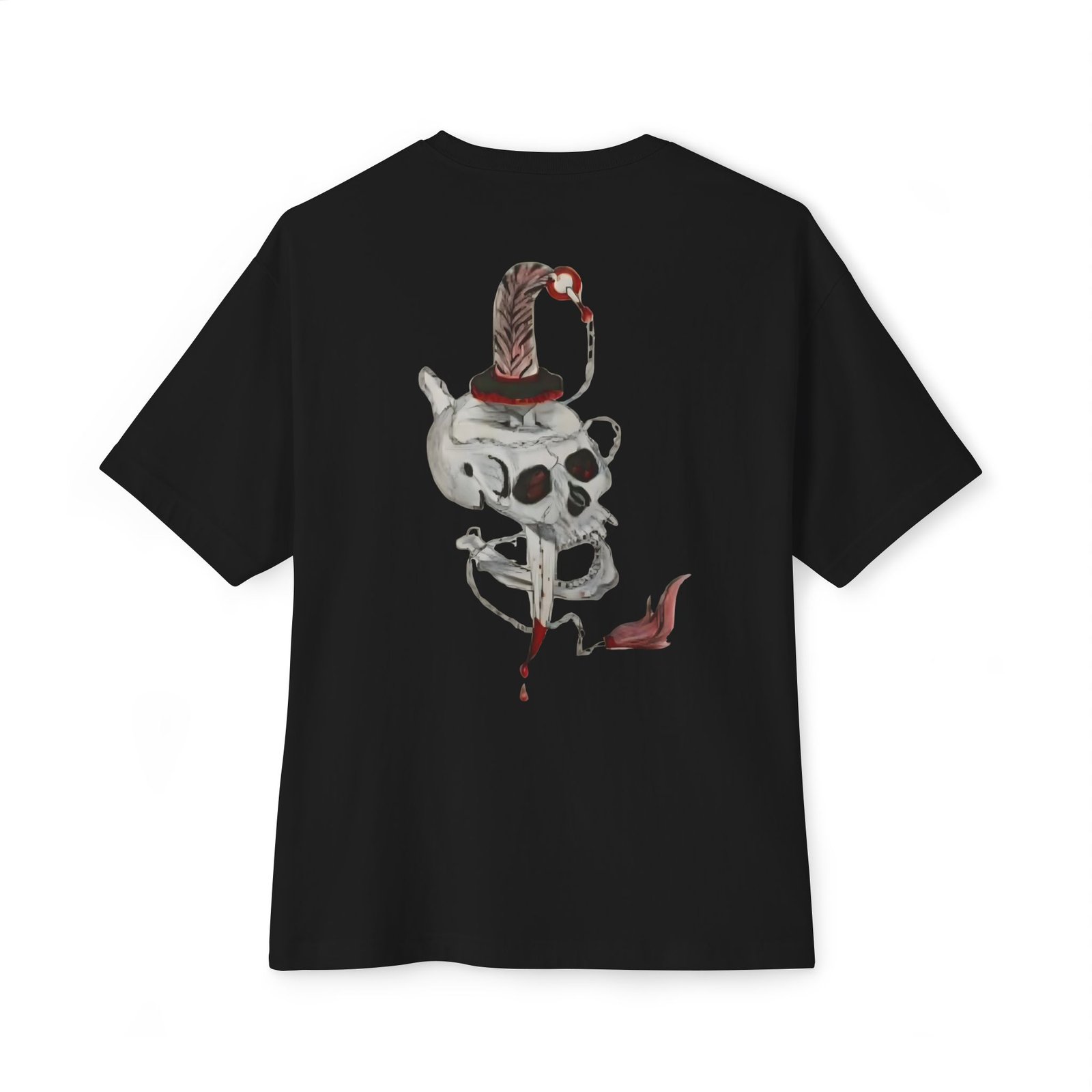 💀 تصميم فني جذاب: يحتوي على طبعة جمجمة وسيف برسالة “Stay Wild and Free” التي تعبر عن الجرأة والانطلاق.