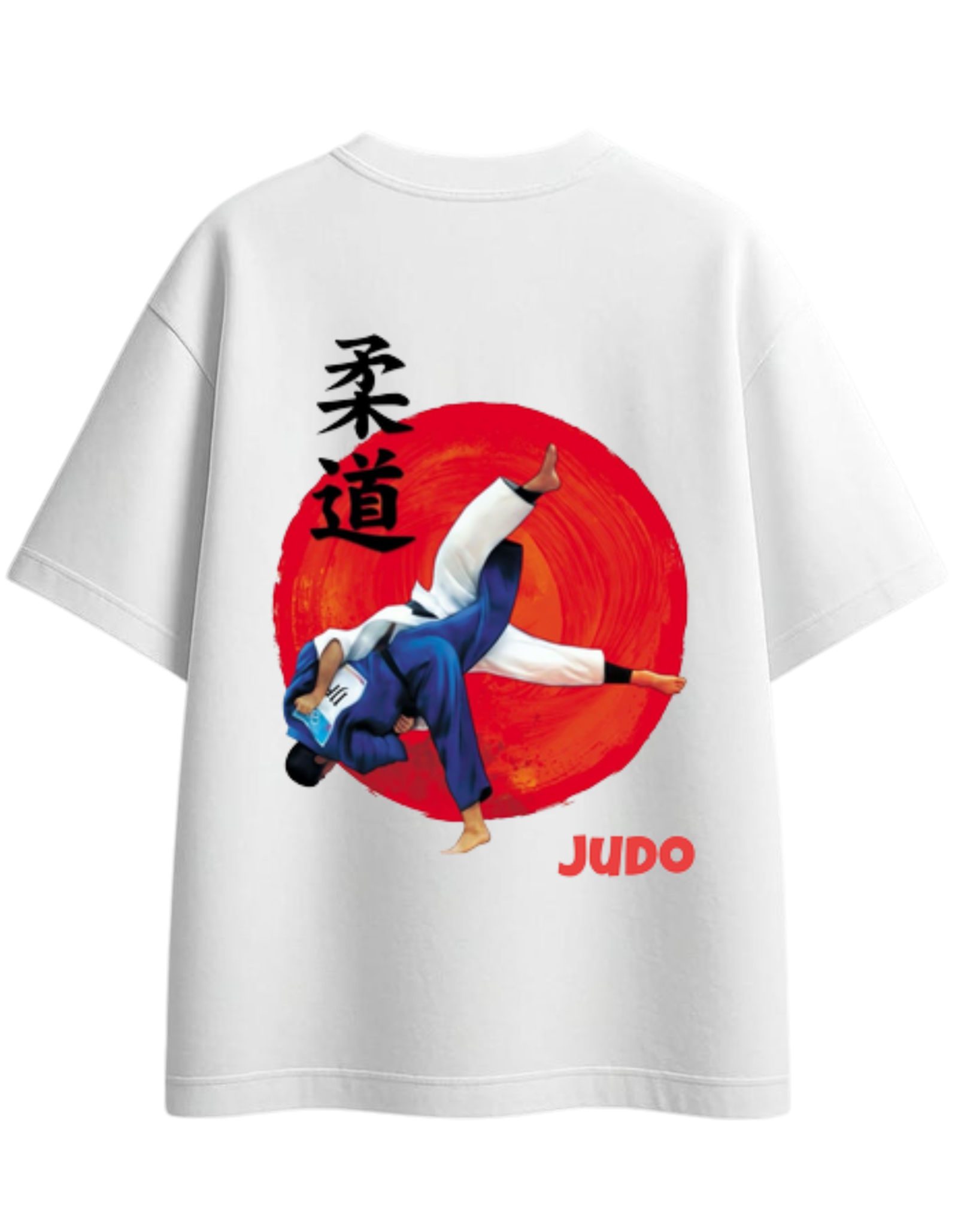 الخلفية: مطبوع بكلمة “柔道” (جودو باليابانية) بخط “كانجي” عريض يمتد عمودياً ليعطي طابعاً أصيلاً.