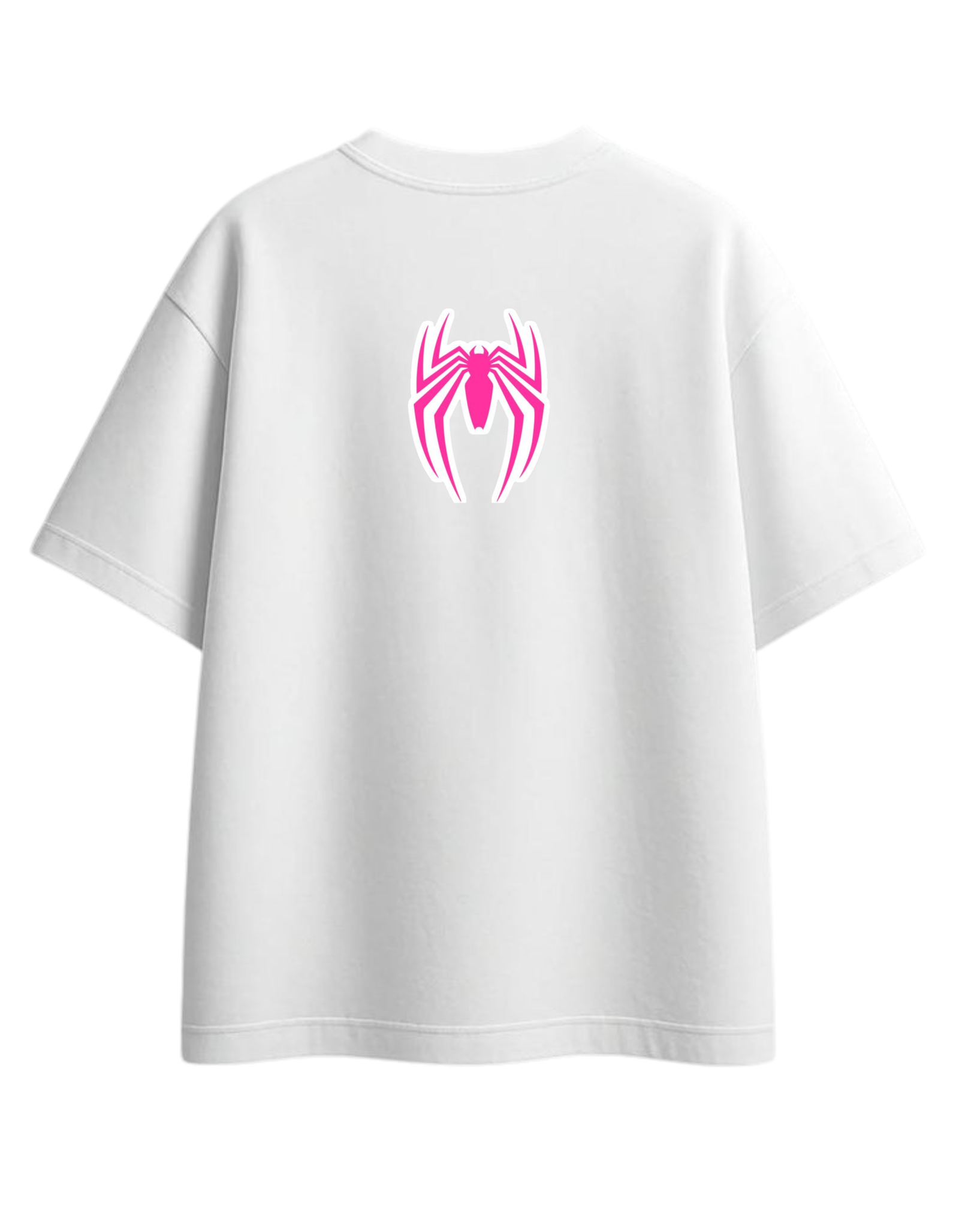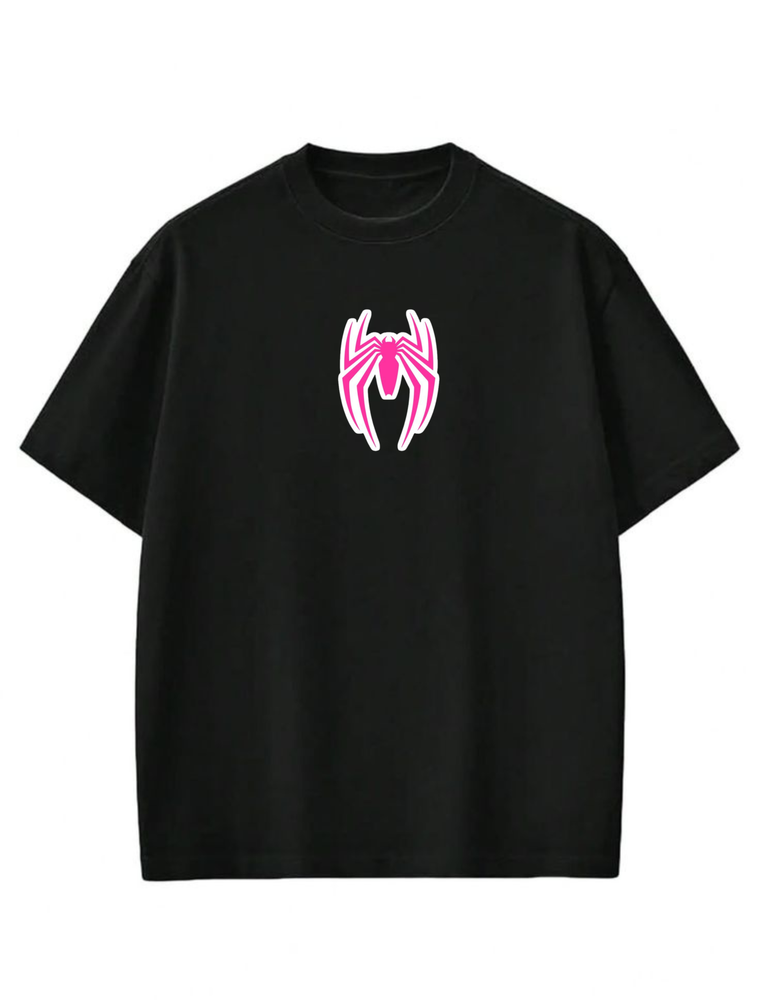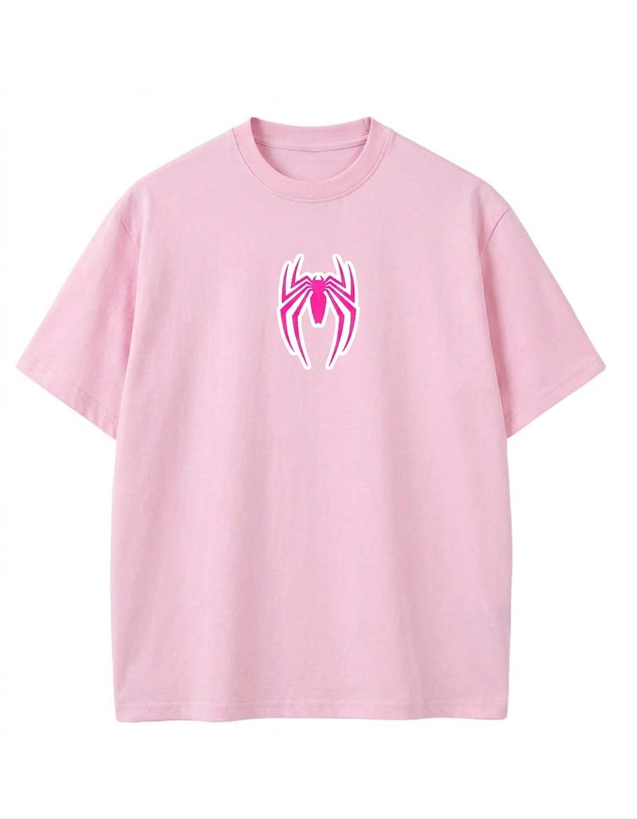 تصميم أيقوني: شعار العنكبوت باللون الوردي الصارخ مع حواف بيضاء يضيف لمسة “Pop Art” جذابة.