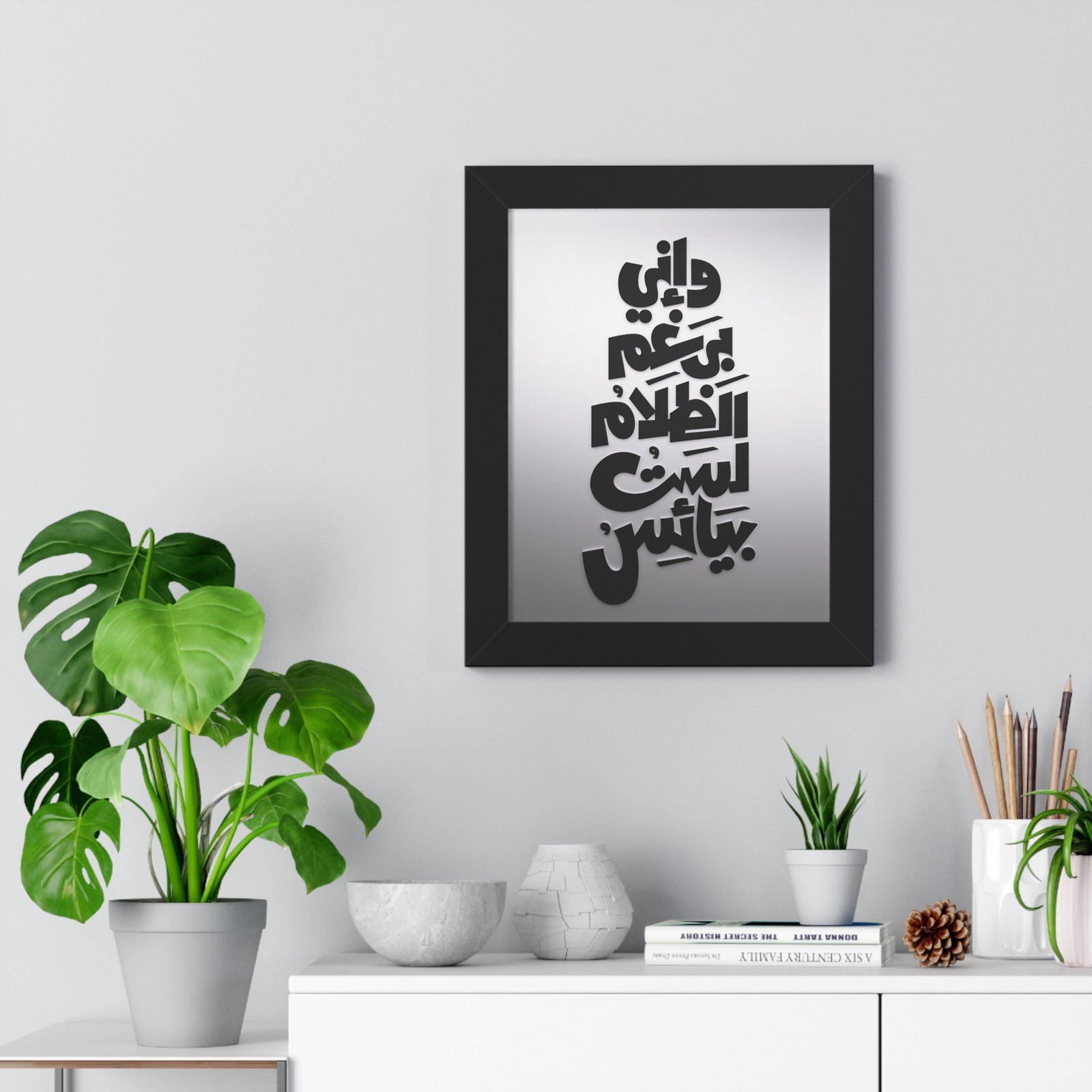 Apportez une touche de résilience à votre intérieur avec cette œuvre calligraphique unique. Le texte proclame avec force : “Et malgré l’obscurité, je ne désespère pas”. Un design minimaliste et audacieux qui transforme un message de persévérance en une pièce d’art contemporaine élégante. Parfait pour un bureau ou un salon zen.