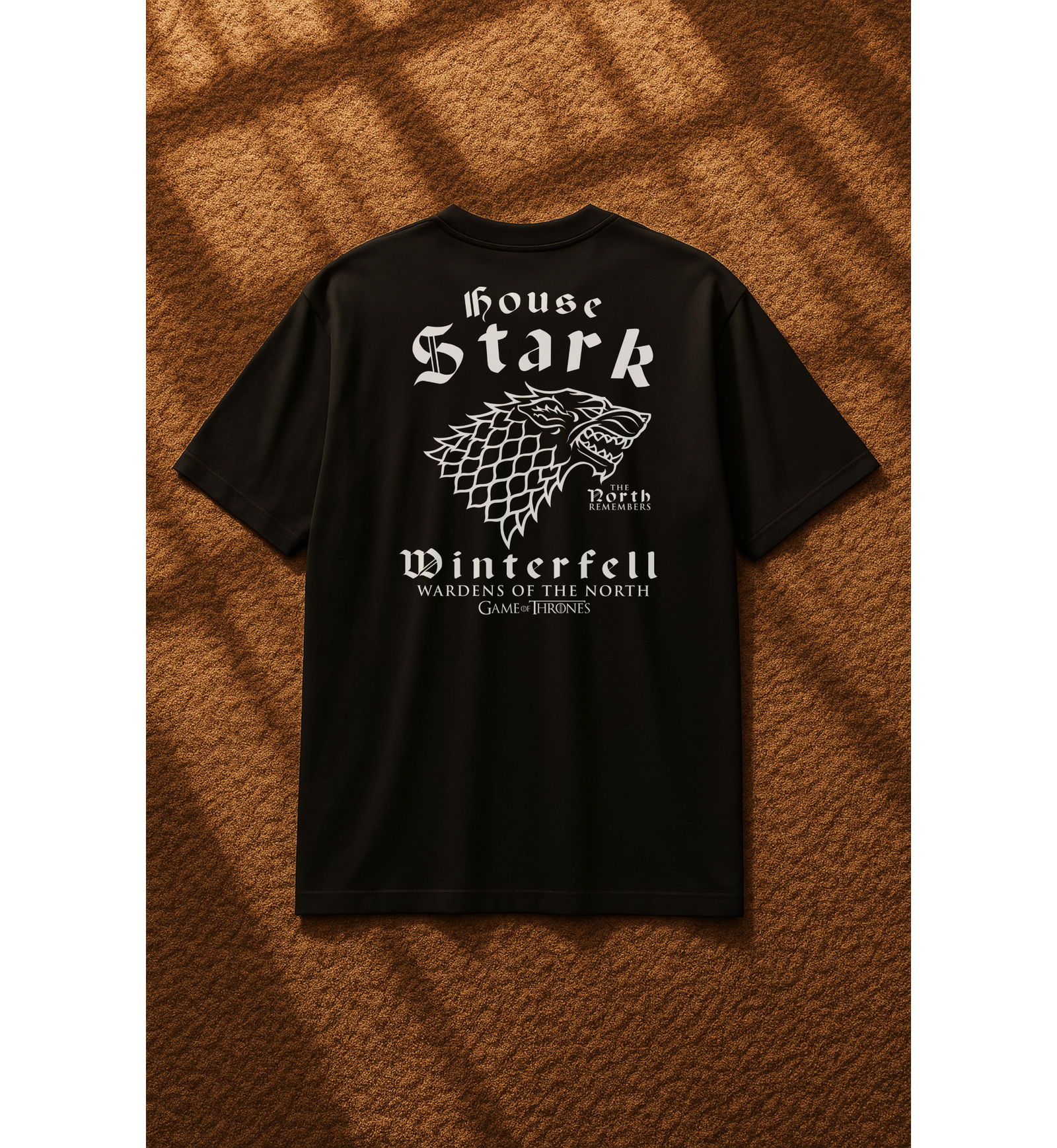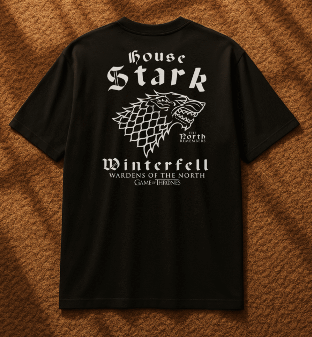 👕 تصميم مستوحى من عائلة Stark الشهيرة في مسلسل Game of Thrones، مع شعار الذئب الرهيب (Direwolf) الأيقوني.
